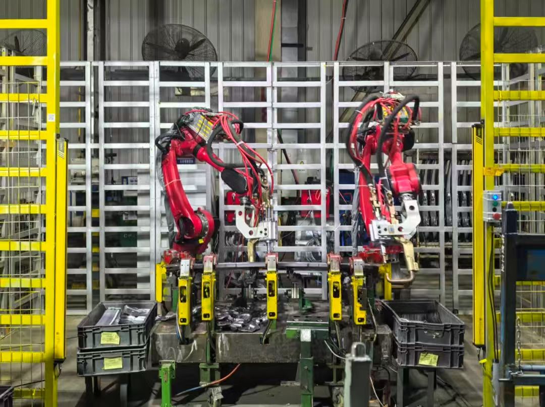 為了快速推進(jìn)項(xiàng)目落地,設(shè)備運(yùn)行團(tuán)隊(duì)聯(lián)動沖焊車間開展發(fā)罩內(nèi)板自動化產(chǎn)線改造。設(shè)備工程師提前學(xué)習(xí)機(jī)器人應(yīng)用、機(jī)器人與PLC進(jìn)行modBusTCP通訊配置學(xué)習(xí),同時(shí)開展電氣系統(tǒng)規(guī)劃設(shè)計(jì)和物料清單采購,設(shè)備工裝設(shè)計(jì)師進(jìn)行機(jī)器人底座設(shè)計(jì)自制和焊鉗選型模擬,聯(lián)合維修團(tuán)隊(duì)完成產(chǎn)線布局、電氣控制系統(tǒng)接線、自動化集成調(diào)試等系列工作;沖焊車間車間負(fù)責(zé)工藝參數(shù)調(diào)整及產(chǎn)線圍欄安裝。經(jīng)改造,單班減少用工2人,產(chǎn)品質(zhì)量得到進(jìn)一步提升。