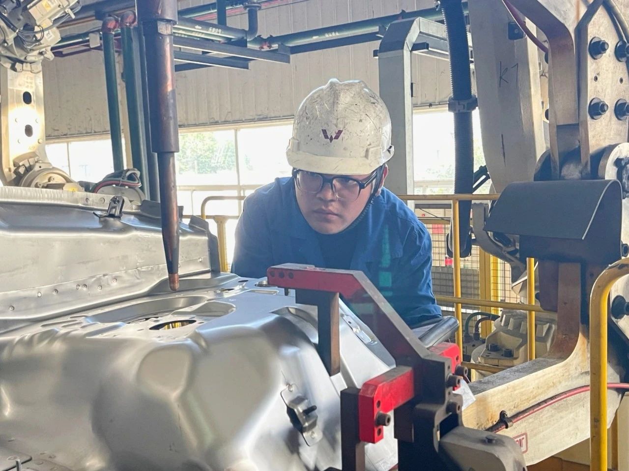 4月,重慶卓通各部門通力協(xié)作,自動化產(chǎn)線建設(shè)進入快車道。設(shè)備團隊負責產(chǎn)線布局、電氣控制系統(tǒng)接線、自動化集成調(diào)試及產(chǎn)線工裝設(shè)計;沖焊車間負責CN112前圍板工裝改造和工藝策劃;技術(shù)部門負責工藝模擬。15天完成場地規(guī)劃與設(shè)備定位,20天實現(xiàn)機器人系統(tǒng)集成調(diào)試,重慶卓通團隊高效協(xié)作推動項目快速落地。