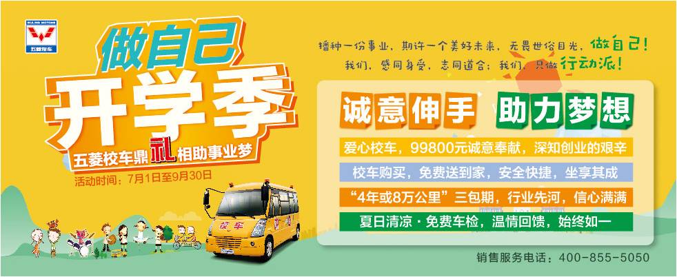 為了助力廣大正在為教育事業(yè)打拼的創(chuàng)業(yè)者一臂之力,成就教育事業(yè)夢想。同時(shí)也為了進(jìn)一步助推中國校車的普及,讓更多的學(xué)齡兒童,尤其是經(jīng)濟(jì)欠發(fā)達(dá)地區(qū)的學(xué)齡兒童乘坐上安全的新國標(biāo)專用校車。五菱校車定于2015年7月1日至9月30日期間,在全國范圍內(nèi)開展“開學(xué)季,做自己!——五菱校車鼎禮相助事業(yè)夢”助力活動(dòng)。