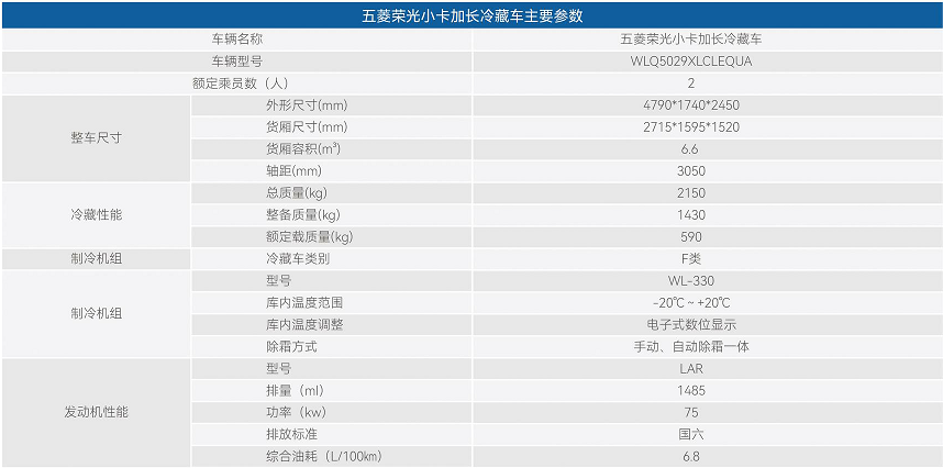 1.5L動(dòng)力,6.6m3容積;F類冷藏車,最低制冷溫度-20℃。
